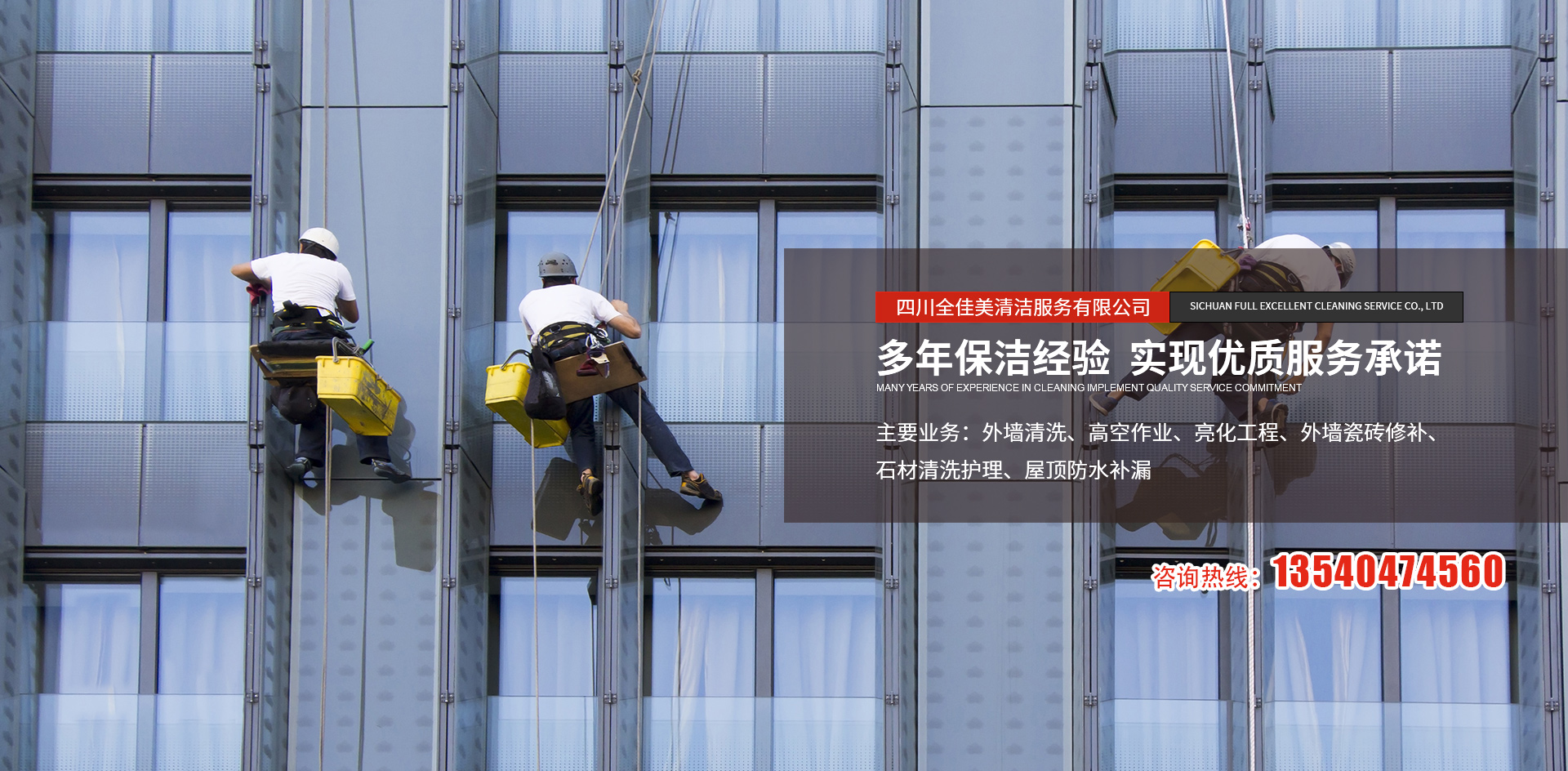 四川全佳美清潔服務(wù)有限公司成立于2017年11月20日,注冊(cè)資本200萬(wàn)元人民幣,是一家專業(yè)從事高空外墻清洗,外墻維修,開荒保潔,石材養(yǎng)護(hù),外墻防水等一體化的工程服務(wù)公司。公司先后服務(wù)于成都鐵路培訓(xùn)學(xué)校,雙流空港酒店,省體育館等寫字樓及工業(yè)園區(qū)的外墻清洗保潔及維修服務(wù)。經(jīng)過(guò)多年的發(fā)展與努力,公司已具備一定的規(guī)模及實(shí)力。現(xiàn)擁有一支技術(shù)精湛的服務(wù)團(tuán)隊(duì),以高標(biāo)準(zhǔn)的服務(wù)品質(zhì),專業(yè)的安全技術(shù)實(shí)力,為全川不同群體的客戶提供更安全,更周到的清洗服務(wù)解決方案,期待與你的合作。
